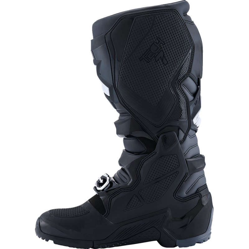 Alpinestars loaded the Tech 7 Enduro Boots with protection features, taking the "no detail too small" approach. Extensive TPU protection on the toes, foot, heel, ankle, calf, and shin, with extra durable compounds on the toe box and heel to further bolster impact resistance. Contoured shin and ankle protectors for excellent levels of impact and abrasion resistance, while soft reinforcements on the ankles for long lasting comfort and shock absorption. The front flexion is supported and enhanced with a progressive design, featuring shock-absorbing inserts in the front bellow for optimum performance. The medial-facing side incorporates a TPU panel with specially designed sculpturing for maximum grip contact with the bike and improved heat and abrasion resistance.